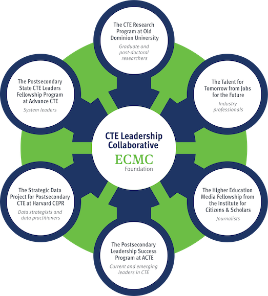 In 2018, ECMC Foundation launched the CTE Leadership Collaborative (LC), an initiative focused on bringing together diverse perspectives and equipping leaders with the resources and skills needed to advance postsecondary CTE. Through grants made to leading organizations and institutions, ECMC Foundation provided funding for six fellowship programs offering professional development including mentoring and skill-building opportunities; in-person and virtual convenings; writing and presenting about learnings; attending conferences; and participating in capstone projects. Each fellowship program (listed below) supports leaders from a range of geographies, variety of disciplines and mix of approaches—known as ECMC Foundation Fellows (Fellows)—dedicated to improving postsecondary CTE.