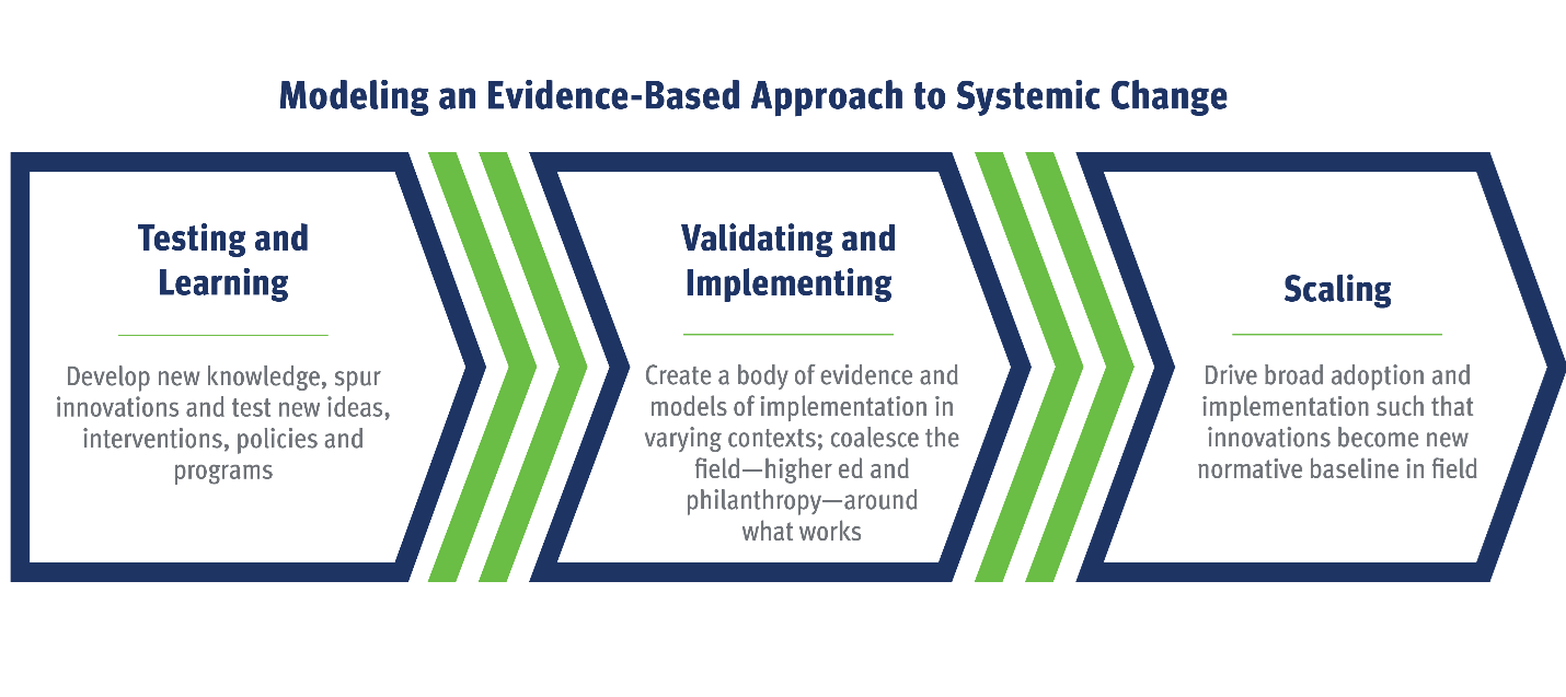 Our strategic priorities represent a three-pronged approach to creating systemic change in higher education that includes creating immediate change by removing obstacles that stand in the way of learner success right now; equipping institutions and organizations to better serve learners; and evolving the postsecondary ecosystem over time to become more adaptive, resilient, and capable of delivering better college completion outcomes for all students.